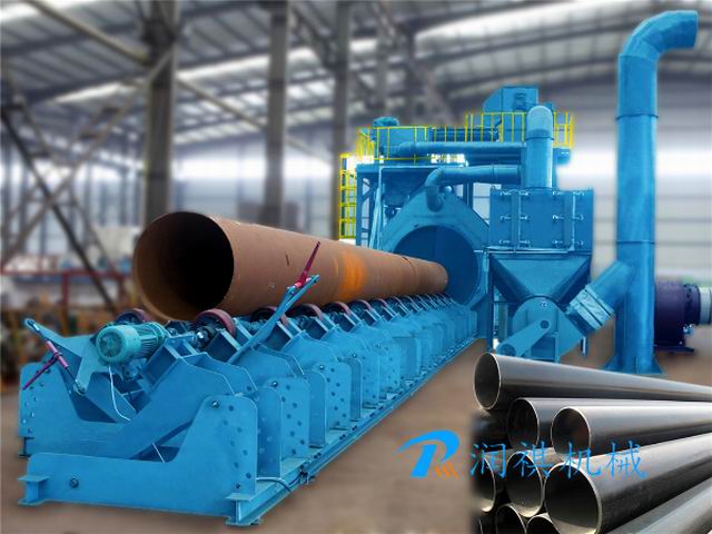 采用液压马达驱动,喷丸清理采用启动马达驱动。 我公司设计的有大管径的内壁抛丸机和直径600mm以下的小型钢管喷丸机等。该设备采用自动抛丸去除表面锈蚀,利用抛丸器抛出的高速